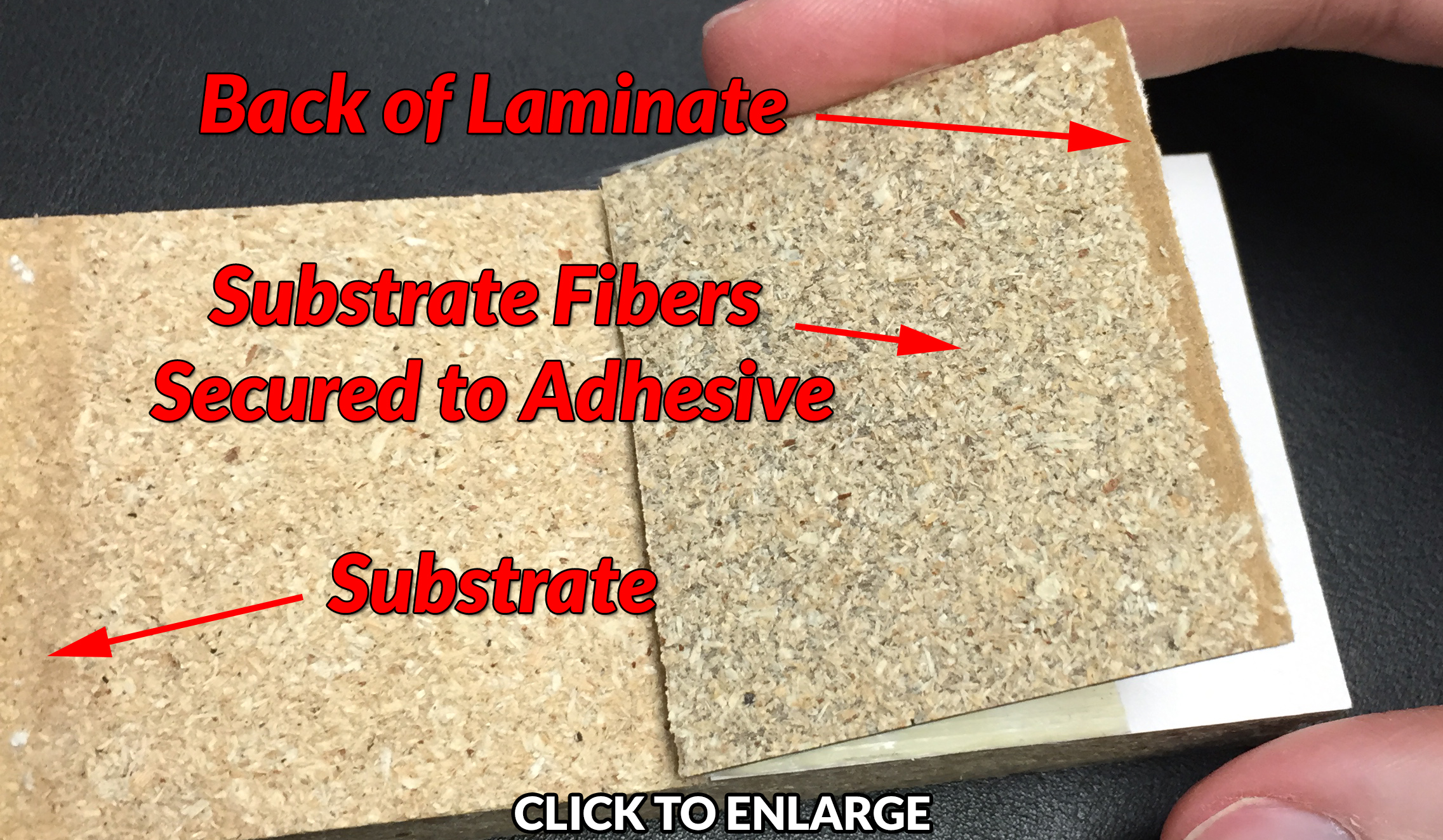 At HMT Manufacturing we regularly conduct destructive testing on a variety of laminate surfaces and substrates bonded using Advantage adhesive. In most cases, the bond is stronger than the materials. This picture shows the result of one bond strength test in which HPL was bonded to particleboard, then delaminated. Notice how particleboard is still adhered to the back of the laminate. The adhesive’s strong bond is still intact after the substrate material’s integrity failed.